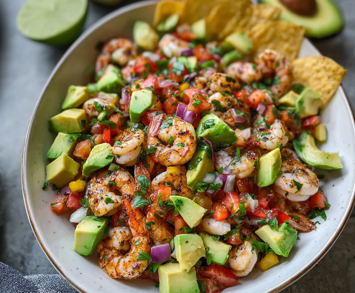 Enjoy this fresh and vibrant salad that perfectly balances creamy avocado, zesty salsa, and tender shrimp!