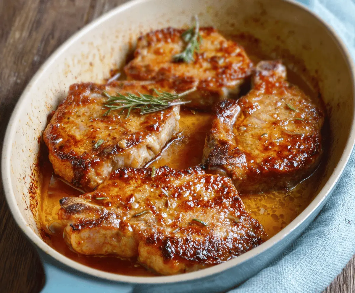 If your skillet isn’t oven-safe, carefully transfer the seared chops to a baking dish. If you’d like, pour in the chicken broth or water to keep the chops moist while baking. This step is optional but highly recommended!