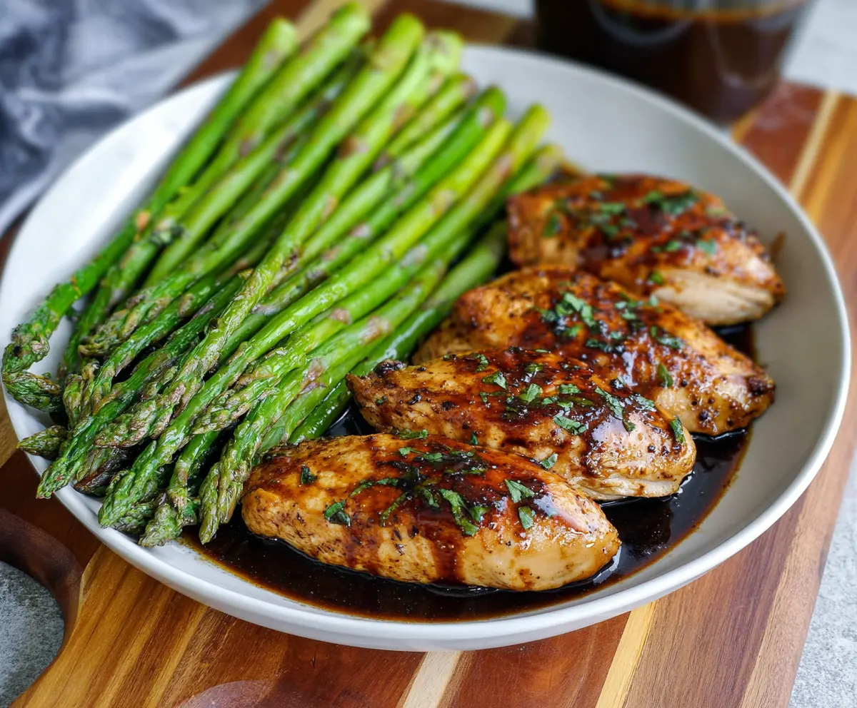 If you’d like, garnish with chopped fresh basil or parsley for a beautiful presentation. Serve immediately and enjoy your delicious balsamic chicken with asparagus!