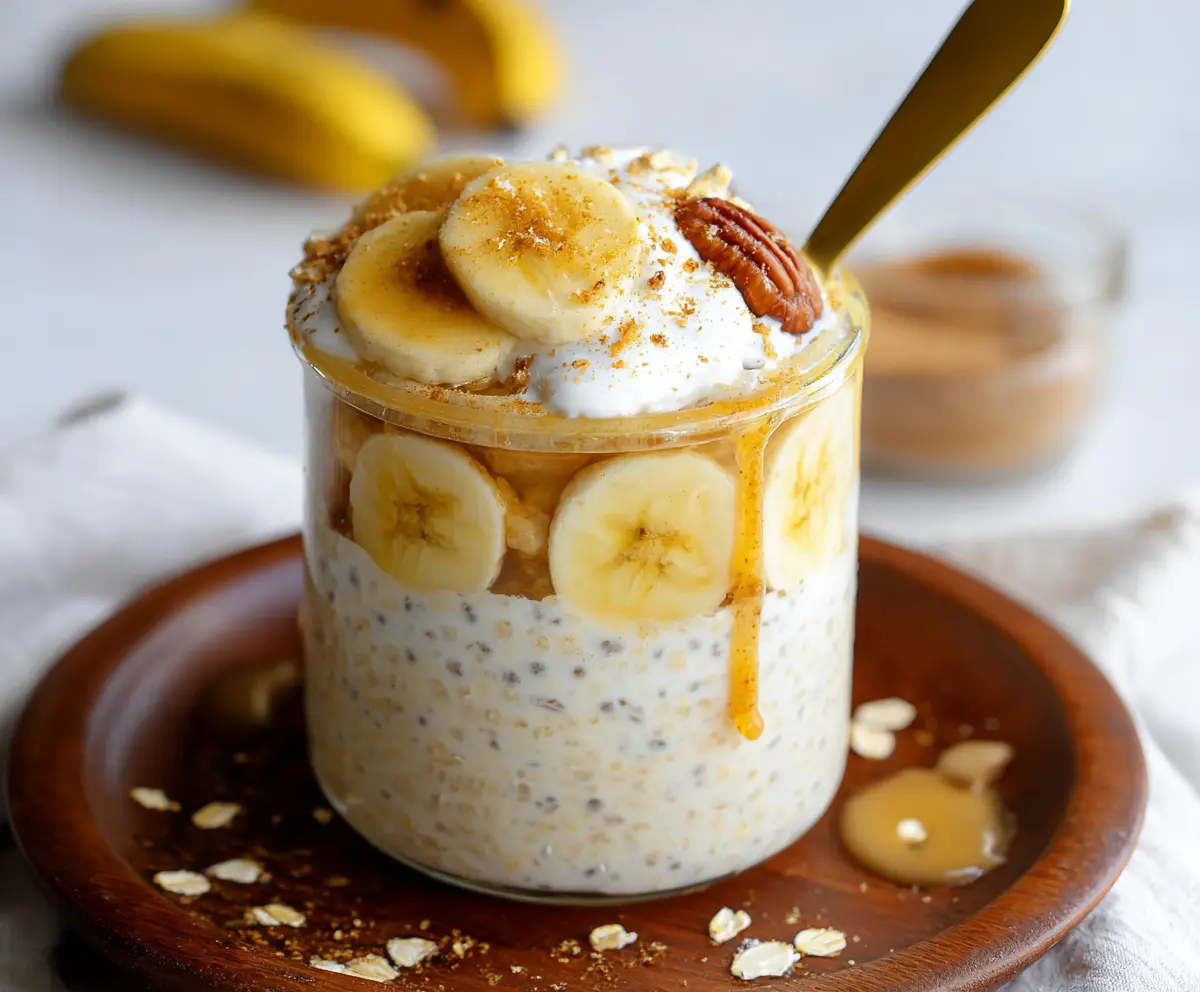 These Banana Cream Pie Protein Overnight Oats are creamy and tasty! With ripe bananas and a touch of vanilla, every bite feels like dessert for breakfast.