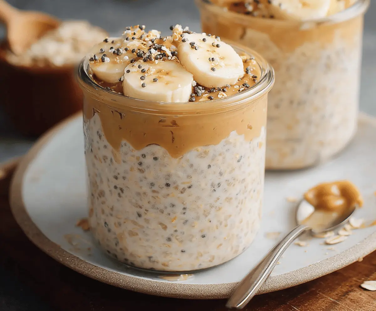 Now, dig in! Serve your Banana Peanut Butter Overnight Oats chilled and enjoy a delightful, creamy breakfast filled with flavor and nutrients.