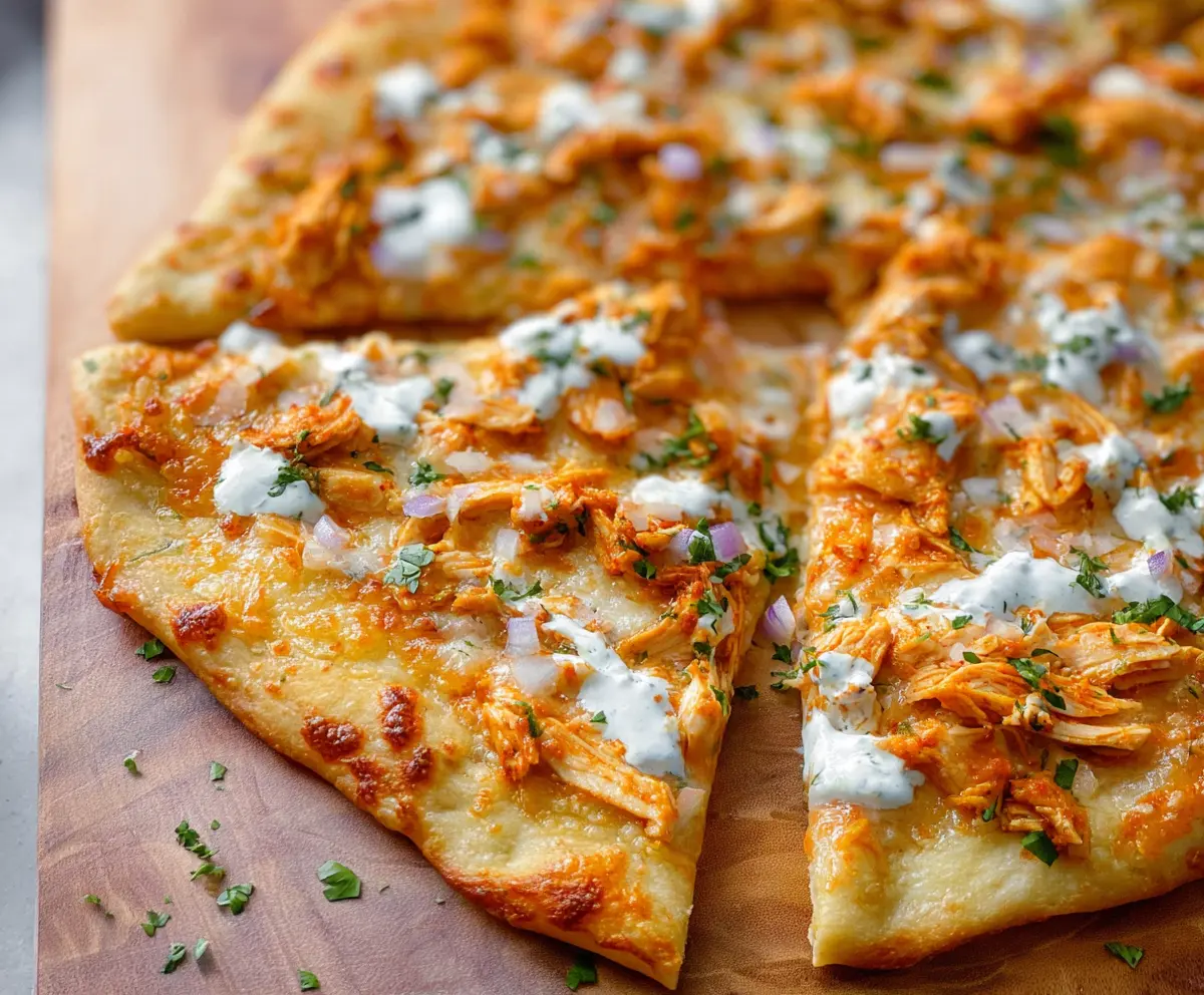 Slice your pizza and serve it hot! It pairs wonderfully with extra ranch or blue cheese dressing on the side for dipping. Enjoy this spicy, cheesy delight!