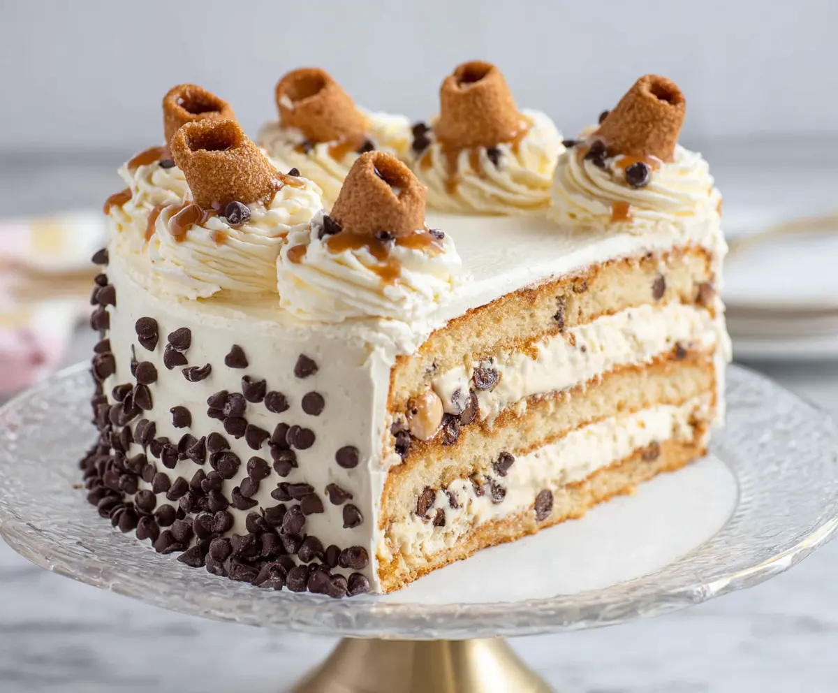 This Cannoli Cake brings the classic Italian treat to your dessert table! It features fluffy cake layers filled with sweet ricotta cream and chocolate chips, just like traditional cannoli.