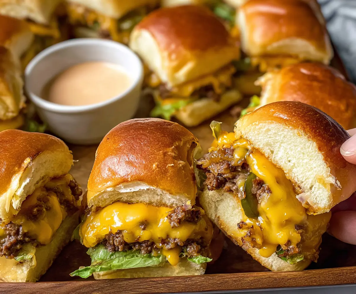 These Cheeseburger Sliders are mini burgers packed with all your favorite flavors! Juicy beef patties sit between soft buns and are topped with cheese, pickles, and your favorite sauces.