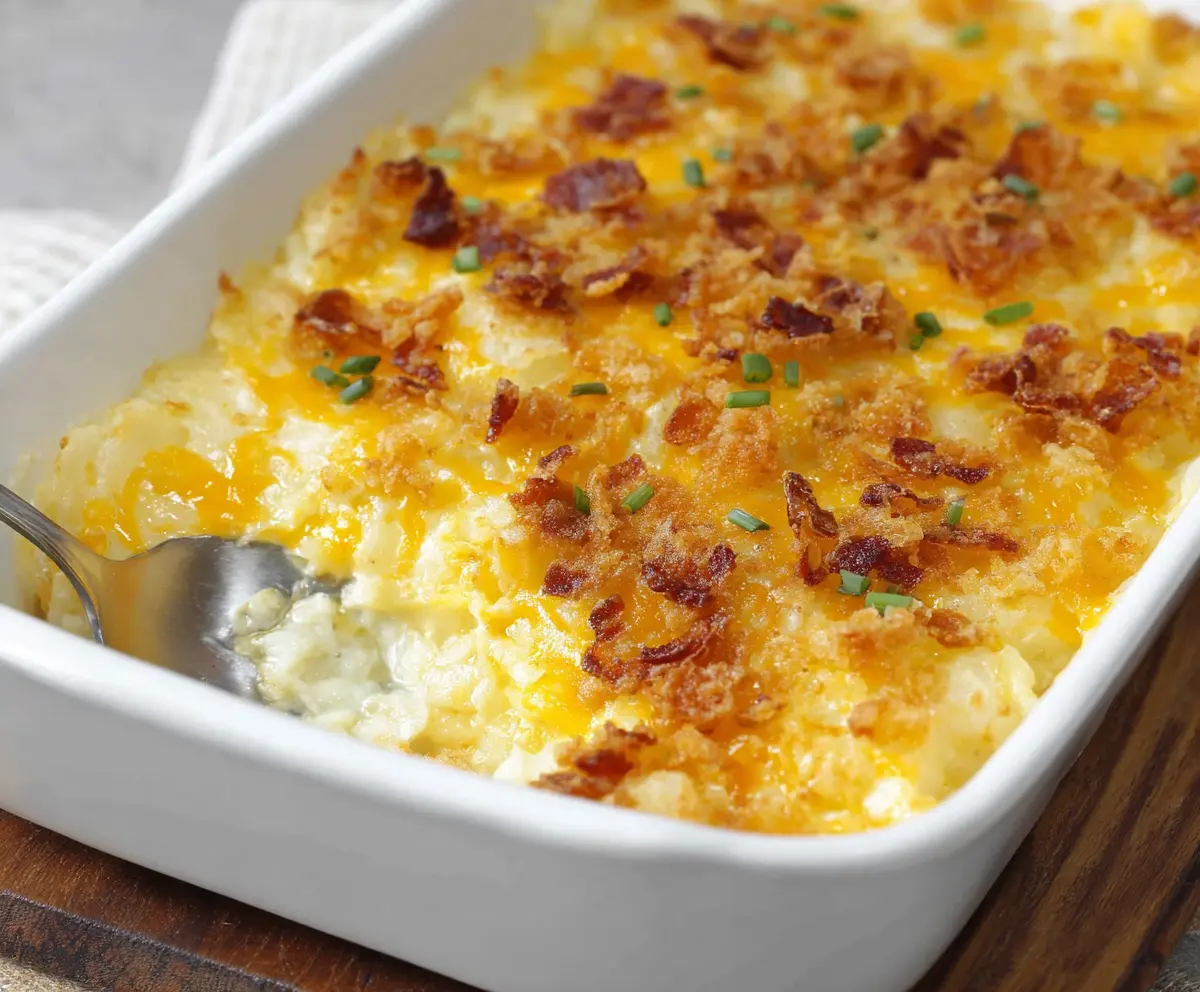 This cheesy baked potato casserole is a warm and comforting dish that everyone loves! With layers of creamy potatoes, rich cheese, and a sprinkle of crispy bacon, it’s pure bliss on a plate.