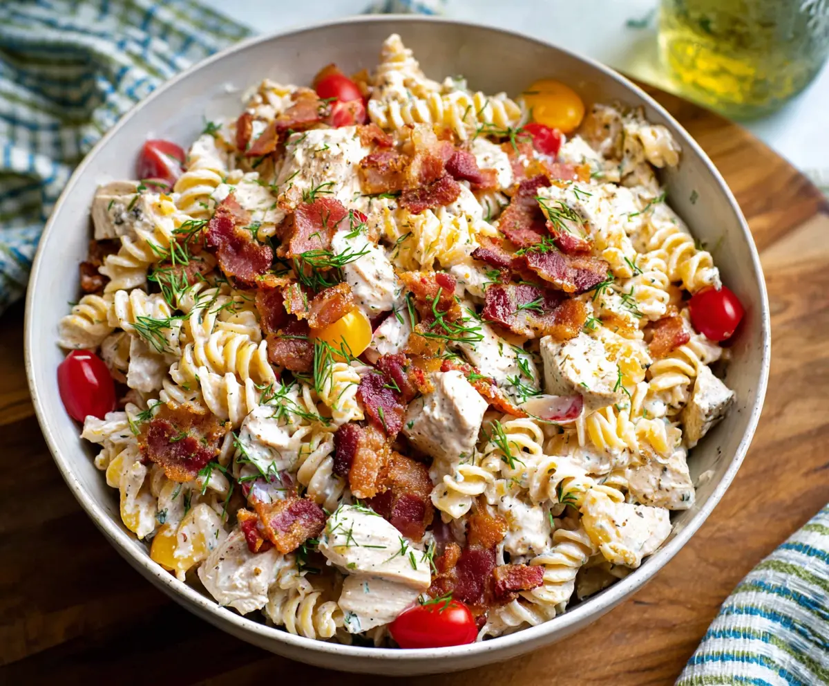 Before serving, give the salad a quick stir to refresh any ingredients that may have settled. You can also garnish it with additional chopped dill or bacon bits for a nice touch. Serve chilled and enjoy this creamy, flavorful Chicken Bacon Ranch Pasta Salad!