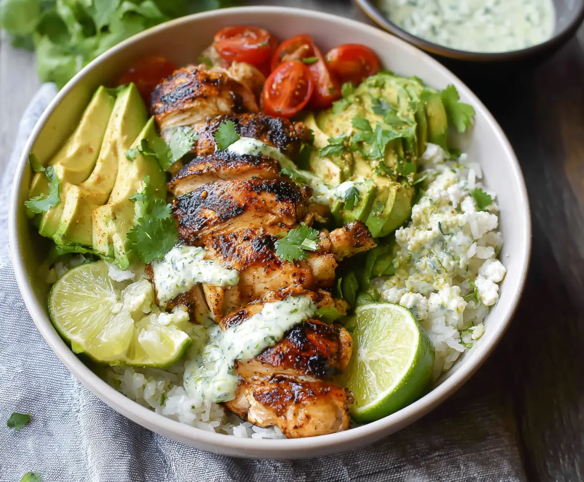 Finally, drizzle the cilantro lime sauce over the chicken and bowls. Garnish with extra fresh cilantro and serve with lime wedges on the side. Enjoy your fresh and zesty Cilantro Lime Chicken Bowls right away!