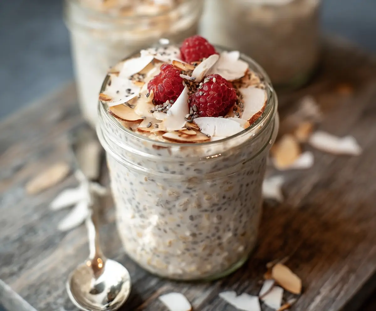 Top your oats with fresh raspberries and a sprinkle of coconut flakes for that extra pop of flavor and texture. Enjoy your creamy, tropical coconut overnight oats!