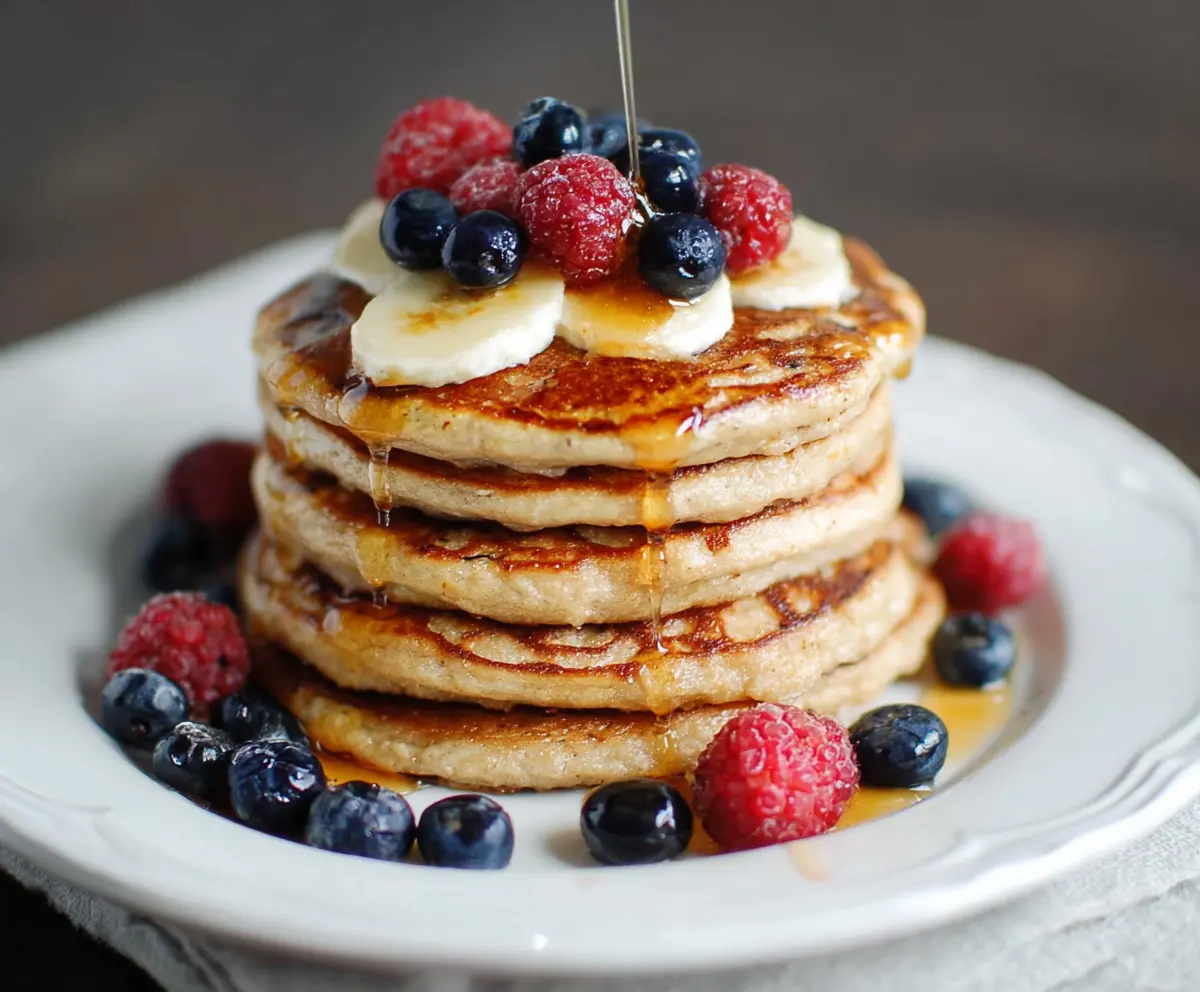 Once cooked, stack your pancakes on a plate and top them with fresh berries of your choice. Drizzle some maple syrup or honey on top for an extra touch of sweetness. Yum!