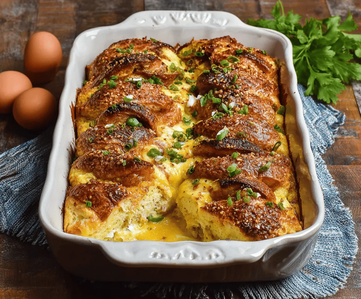 This Croissant Breakfast Casserole is like a warm hug on a plate! Flaky croissants mix with eggs, cheese, and your favorite toppings for a comforting morning treat.