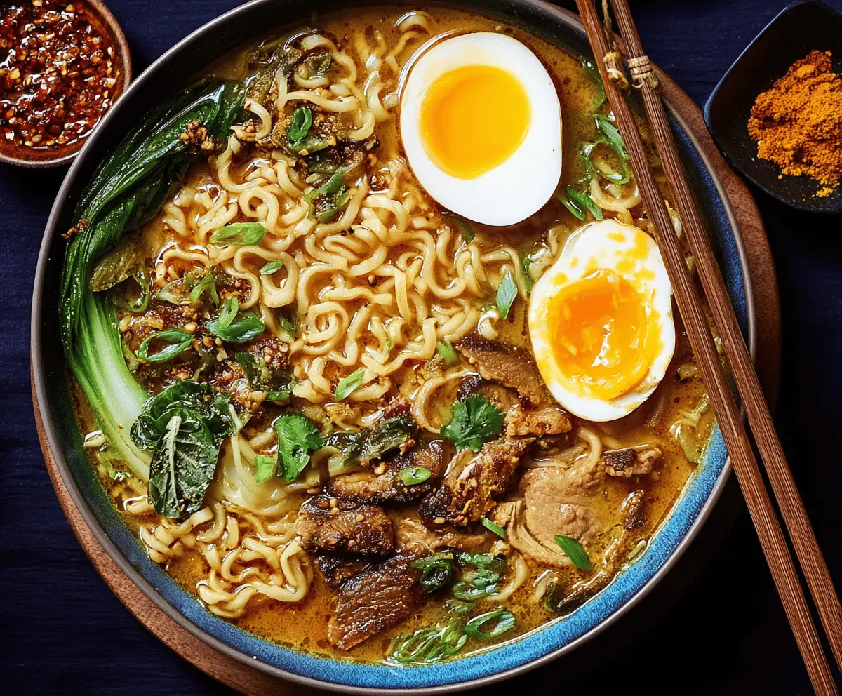 This dish is full of flavor with a rich, spicy broth, tender noodles, and delicious toppings—perfect for a comforting meal!