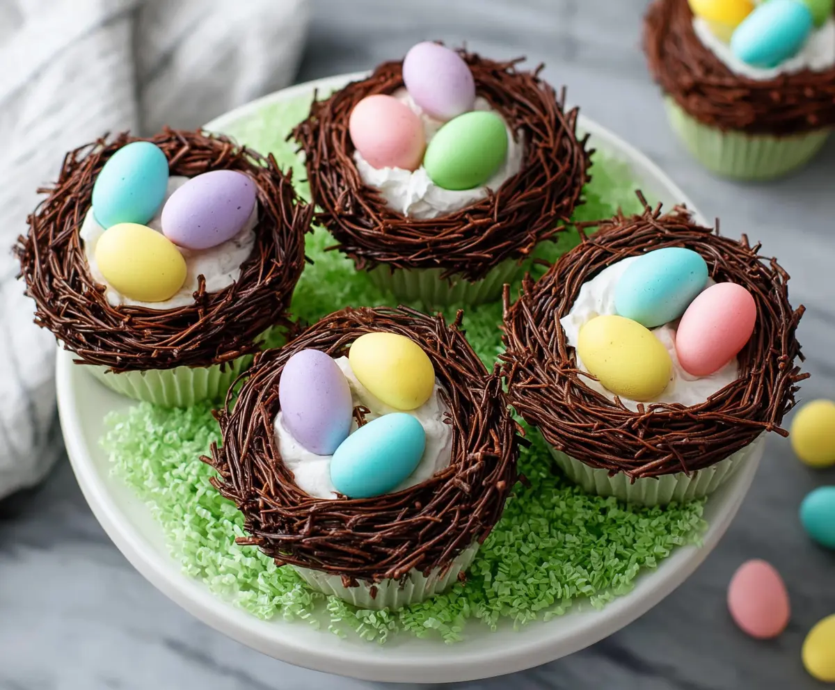 These adorable Easter Egg Nest Cupcakes are a fun treat for everyone! They are soft chocolate cupcakes topped with fluffy frosting that looks like a cozy nest.