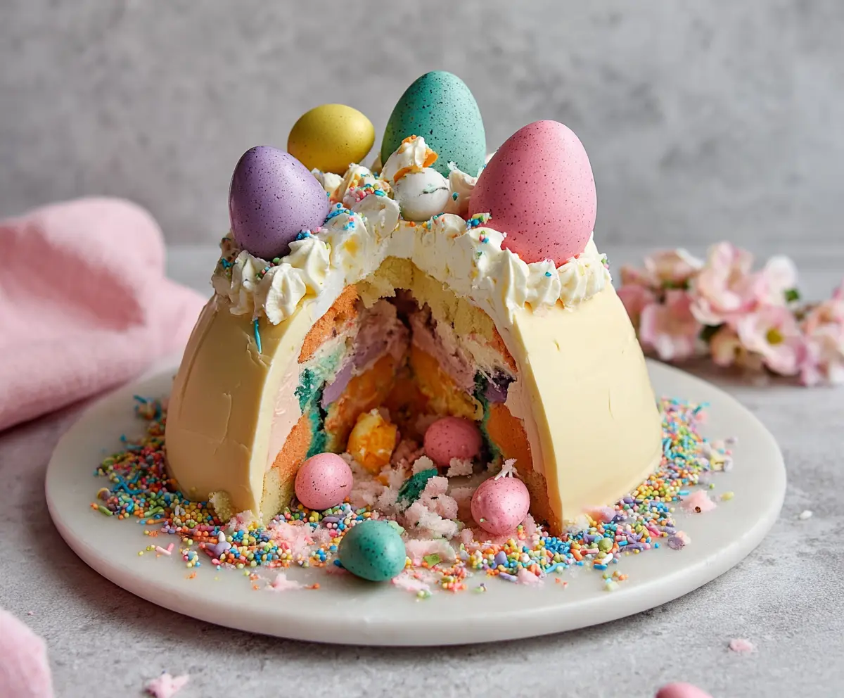Enjoy your festive and vibrant Epic Easter Egg Smash Cake, perfect for spring celebrations!