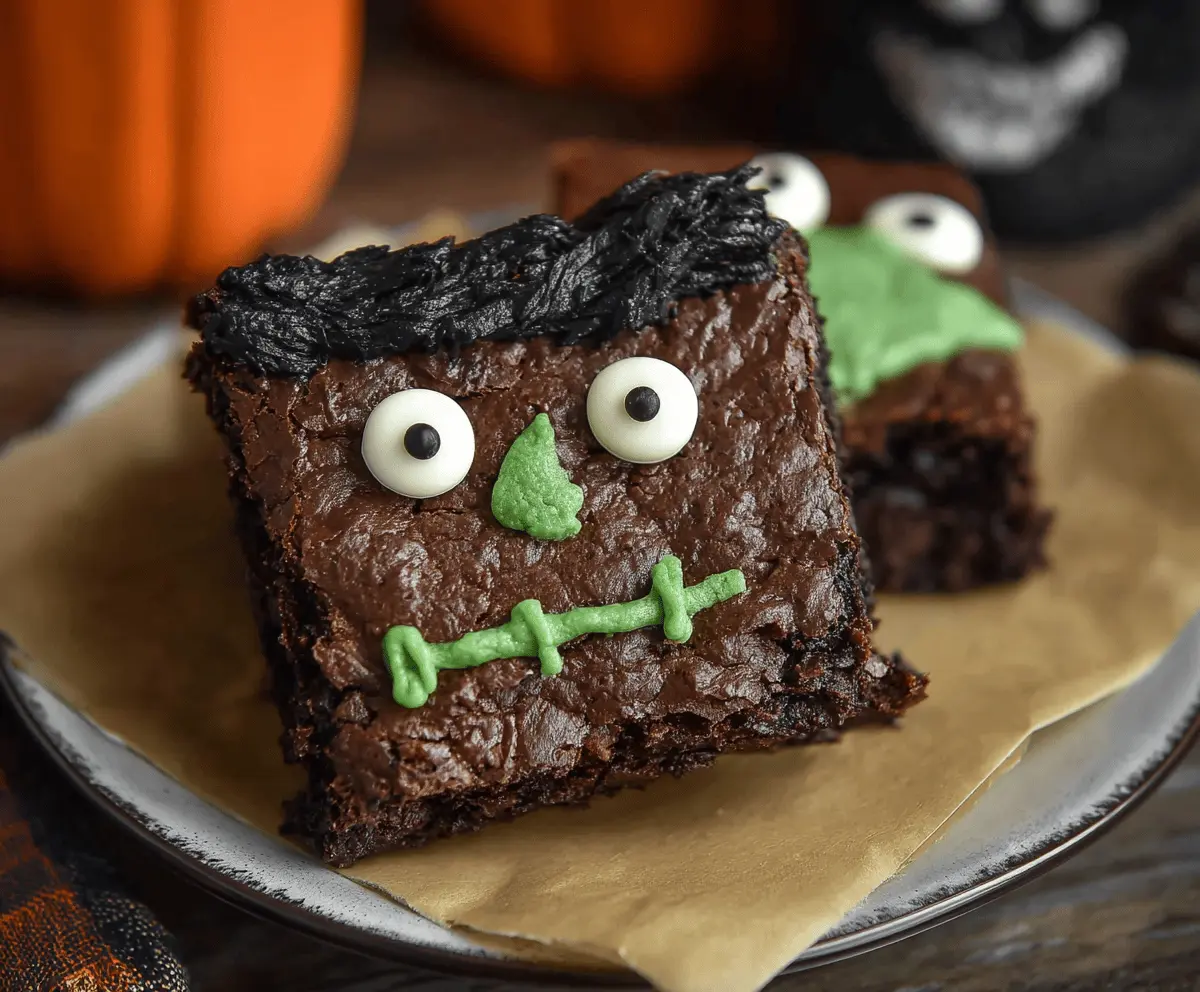 Let the decorated brownies sit for a few minutes to allow the frosting to firm up a bit. Then, slice them up and enjoy your wonderfully spooky Frankenstein brownies! Perfect for Halloween gatherings or any fun-themed parties!