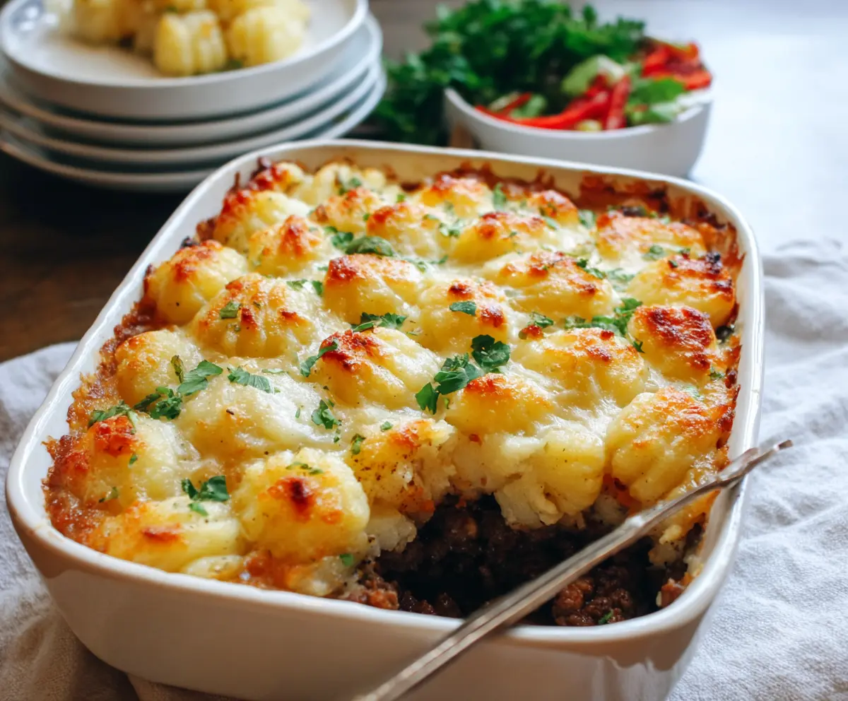 This Gnocchi Shepherd’s Pie is a cozy twist on the classic dish! It features tender gnocchi topped with a tasty mix of veggies and savory meat, all baked to golden perfection.