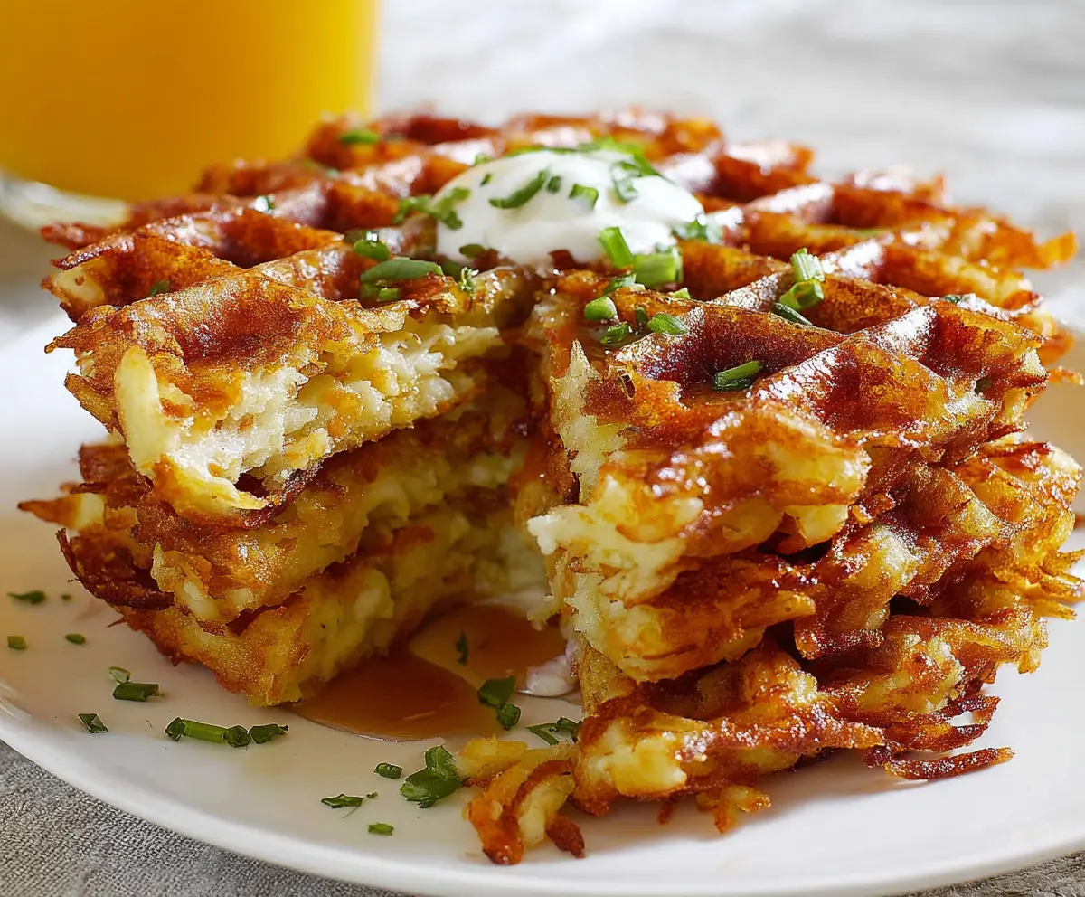 Once cooked, carefully remove the waffles from the iron and place them on a plate. Repeat the process with the remaining mixture. Serve your delicious hash brown waffles warm, topped with a dollop of sour cream and a sprinkle of fresh chopped chives.