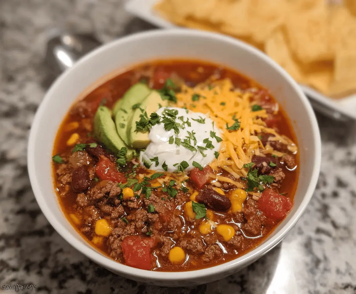 Serve the beef taco soup hot! Top it with your choice of shredded cheddar cheese, a dollop of sour cream, fresh cilantro, lime wedges for a burst of freshness, and crunchy tortilla chips. Enjoy this deliciously satisfying meal!