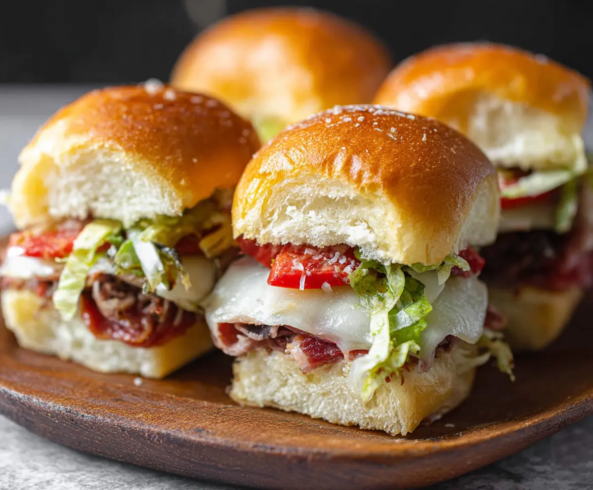 Italian Grinder Sliders are delicious little sandwiches filled with ham, salami, and cheese. They sit on soft rolls and are topped with a zesty dressing that makes every bite tasty!