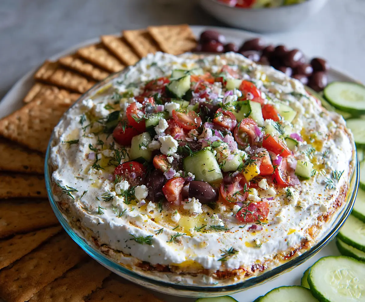 This Layered Greek Dip is like a party on a plate! It’s packed with creamy layers of yogurt, fresh veggies, and tasty olives, all sitting pretty in a colorful dish.
