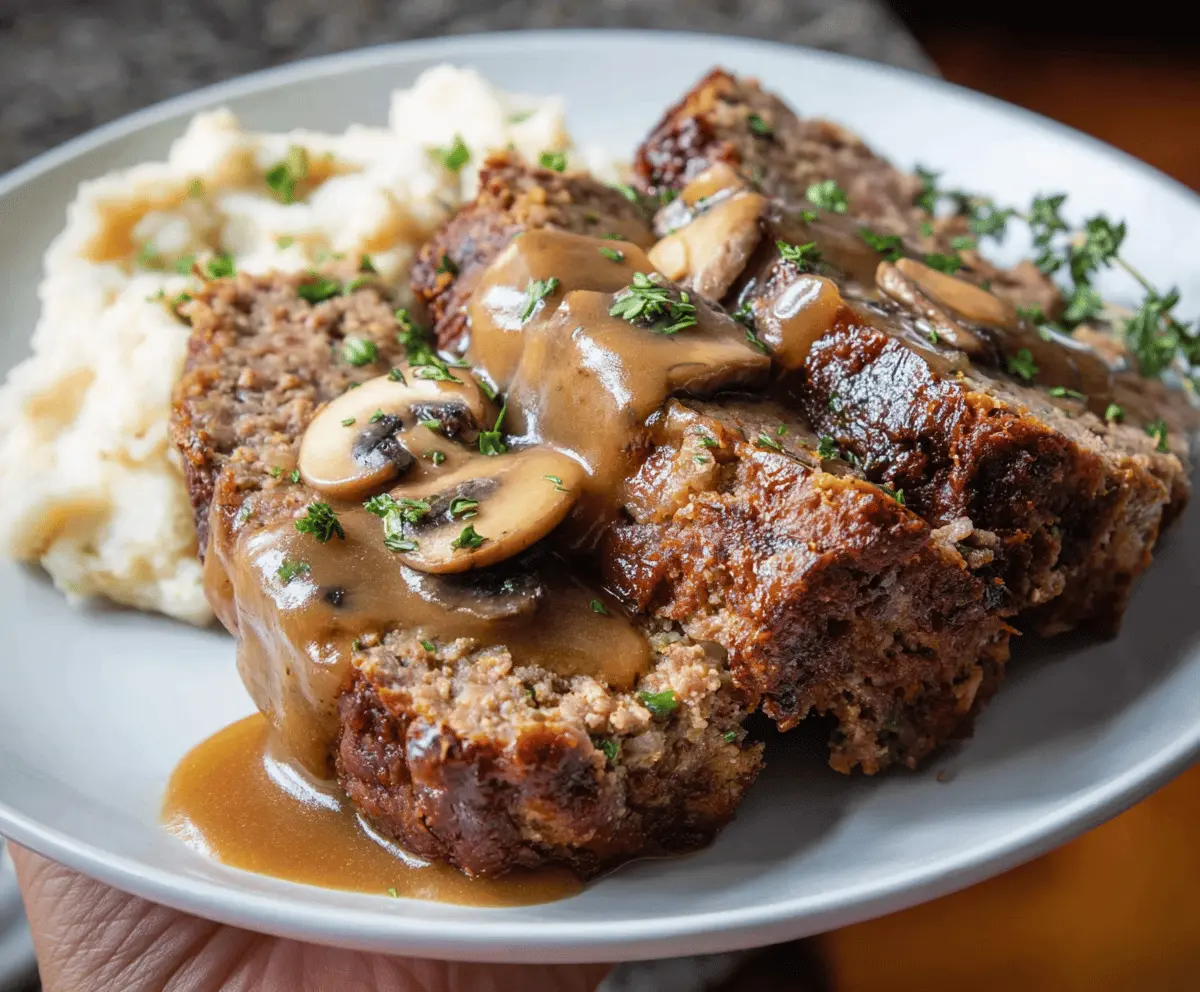 After baking, allow the meatloaf to rest for 5-10 minutes. This makes it easier to slice. Serve each slice generously topped with the mushroom gravy and garnish with chopped parsley for a fresh touch.