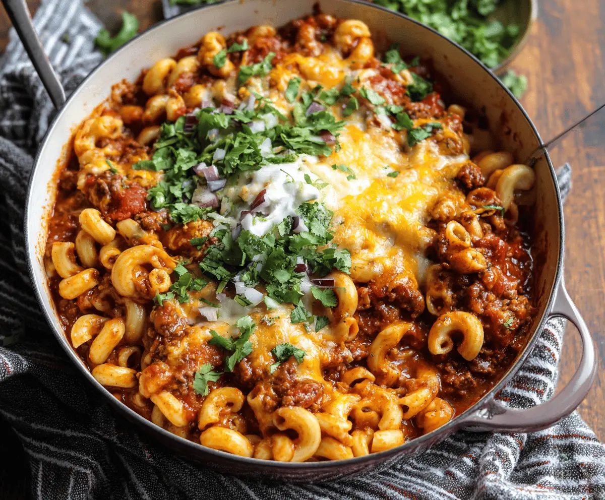 Garnish your delicious chili mac with fresh chopped cilantro or parsley. If you’re feeling a bit spicy, top it off with sliced jalapeños. Serve hot and enjoy every cheesy, hearty bite!