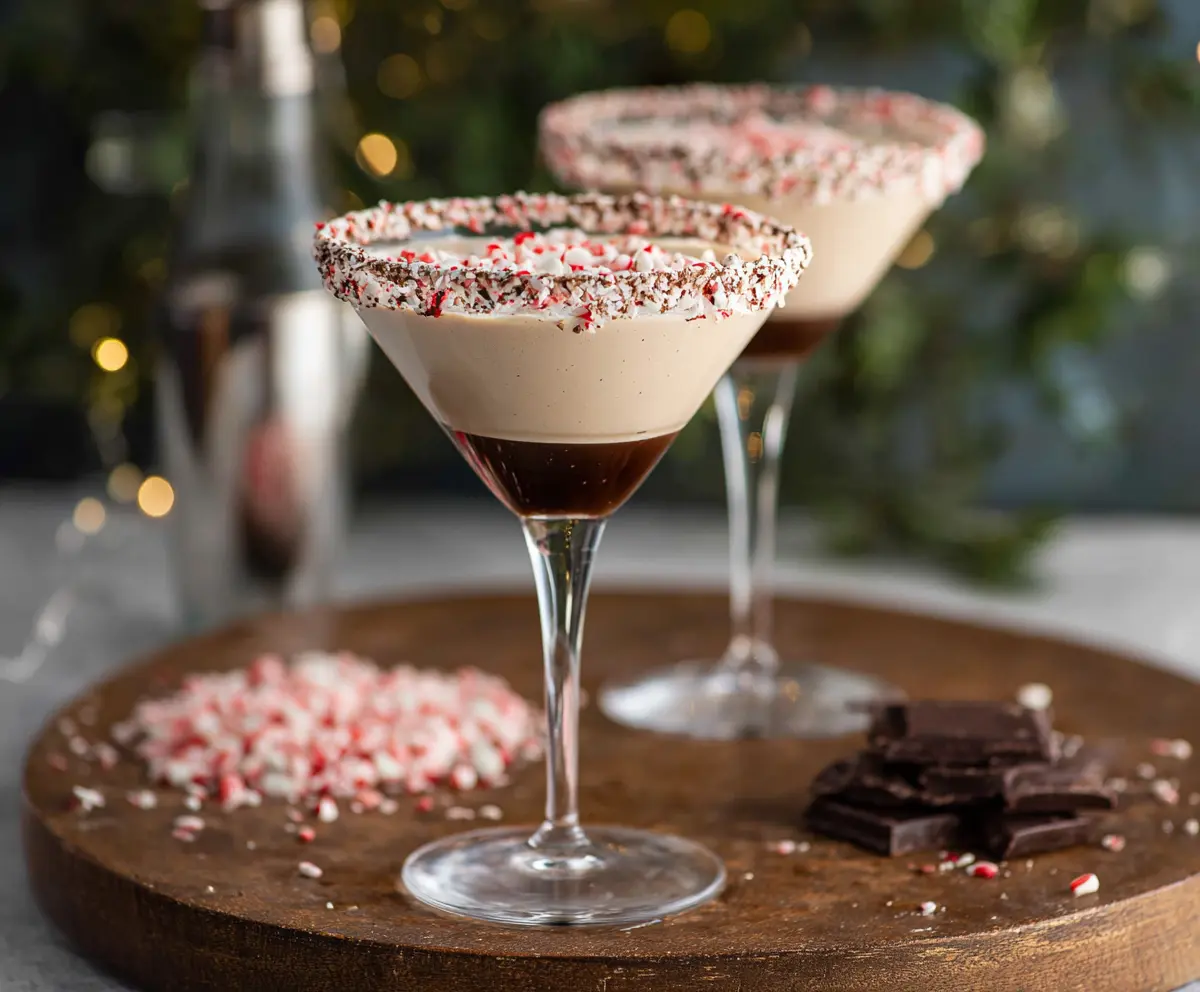 Start by getting your glasses ready. Take some simple syrup or water and rim the edges of the martini glasses with it. Then, dip the rim into a mix of crushed candy canes and chocolate shavings. Set the glasses aside to dry while you make your cocktail.