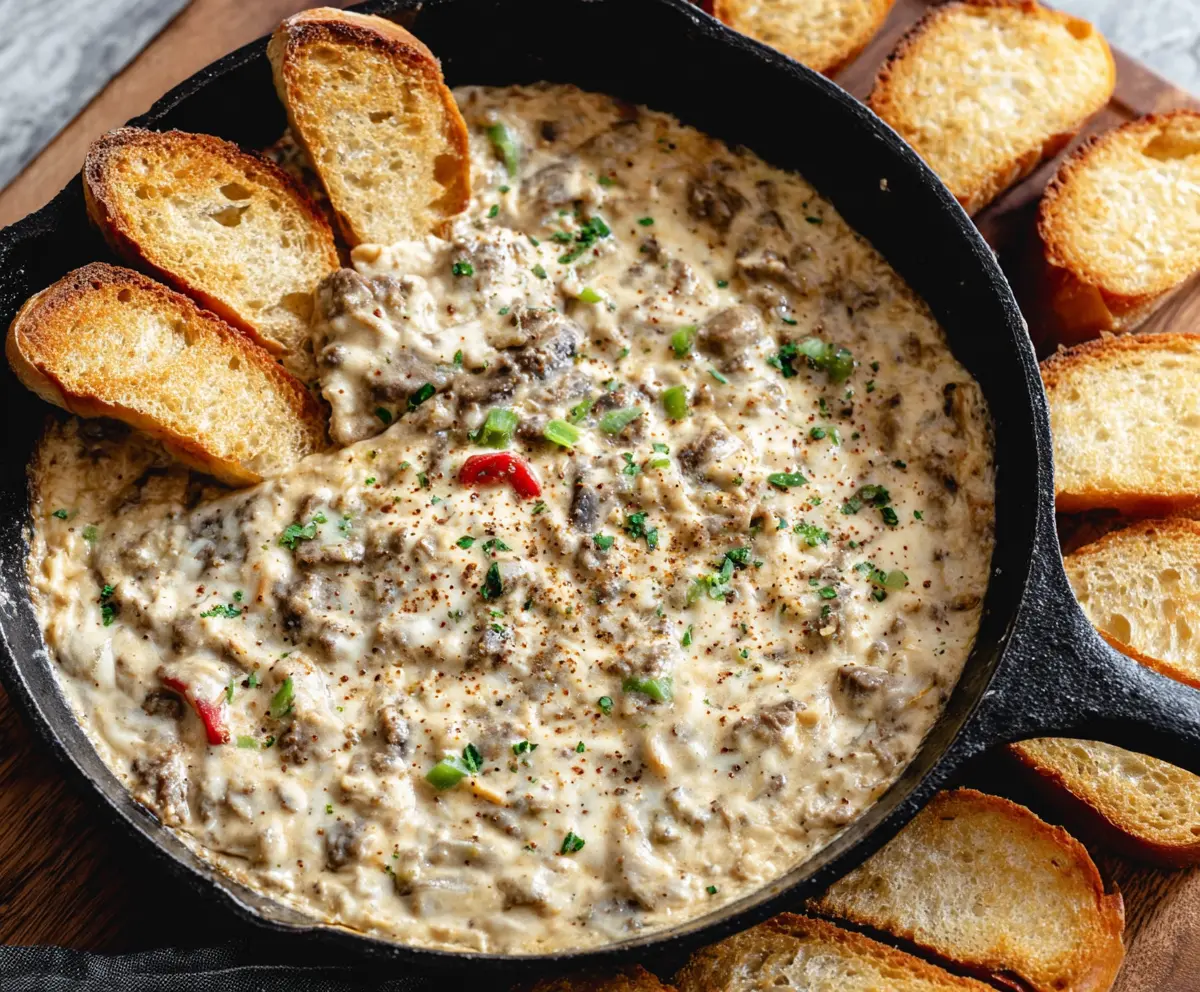 Finally, garnish your dip with chopped green onions or chives for a fresh touch. Serve it warm with slices of toasted baguette or sturdy crackers for dipping. Now you’re ready to dig in and enjoy your creamy, savory Philly Cheesesteak Dip!