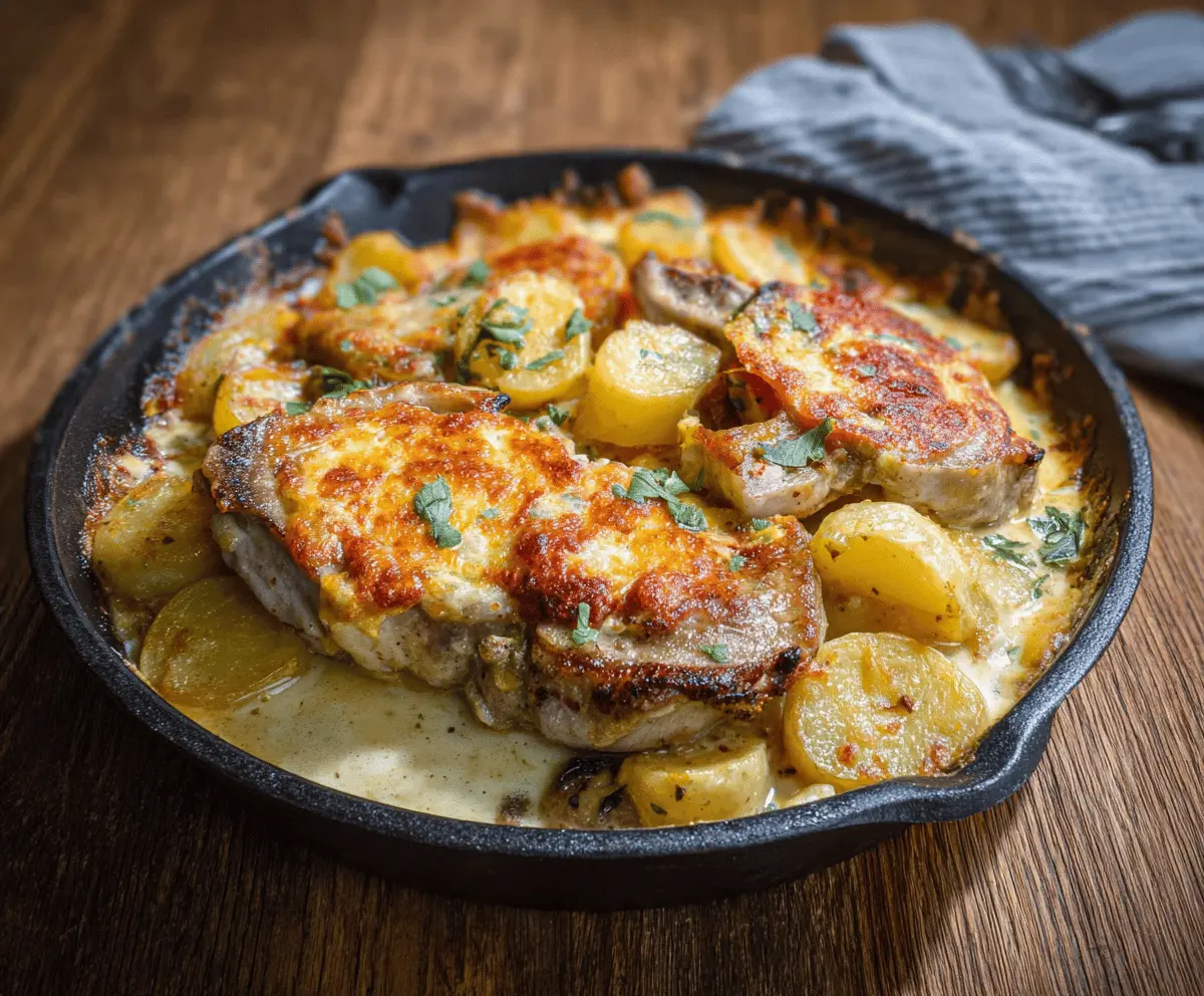 Garnish with freshly chopped parsley before serving. Enjoy your creamy and flavorful Pork Chops and Potatoes Casserole!