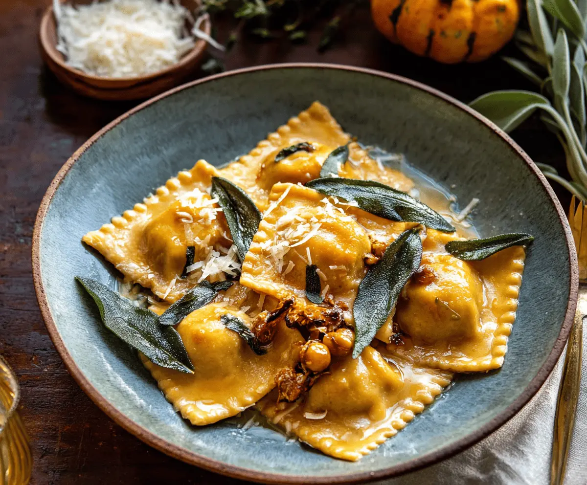 Enjoy every bite of this delightful Pumpkin Ravioli with Brown Butter Sage sauce!
