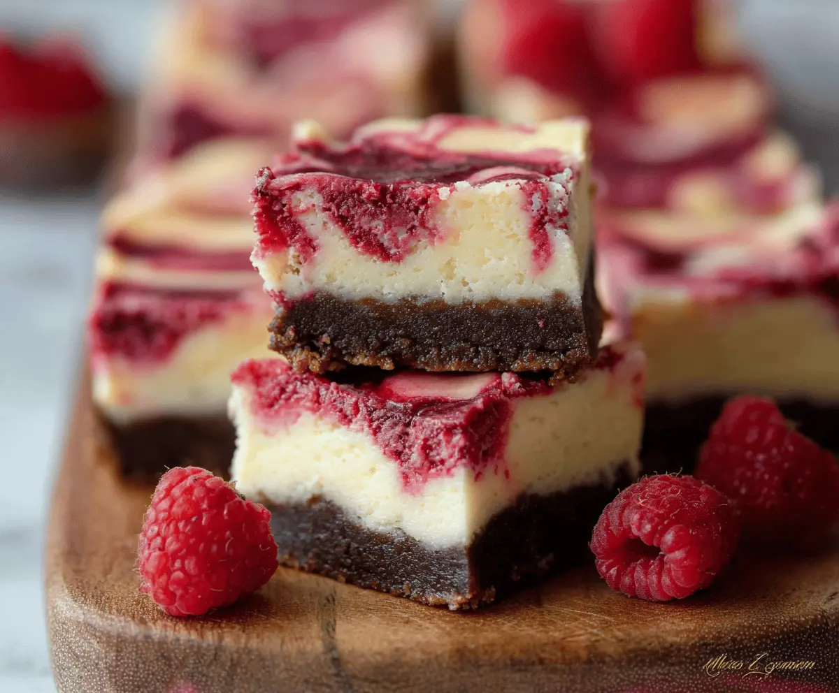 These Raspberry Cheesecake Bars are so delicious! With a rich chocolate crust, smooth cheesecake, and a zesty raspberry swirl, they’re sure to become a favorite!