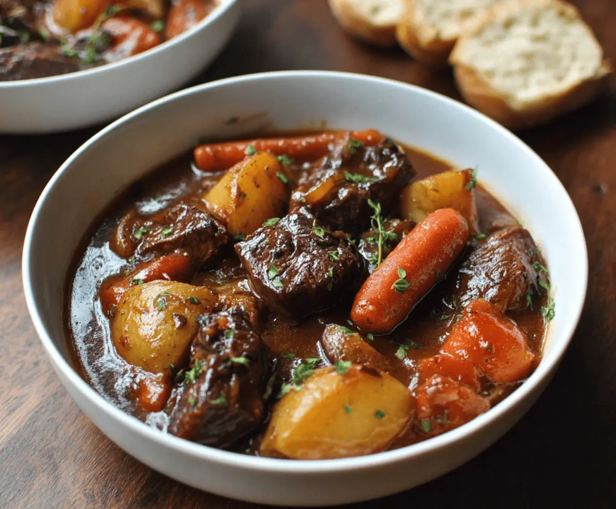 This warm and hearty beef stew is packed with juicy pieces of beef, colorful carrots, and fluffy potatoes, all simmered in rich red wine. It’s like a cozy hug in a bowl!