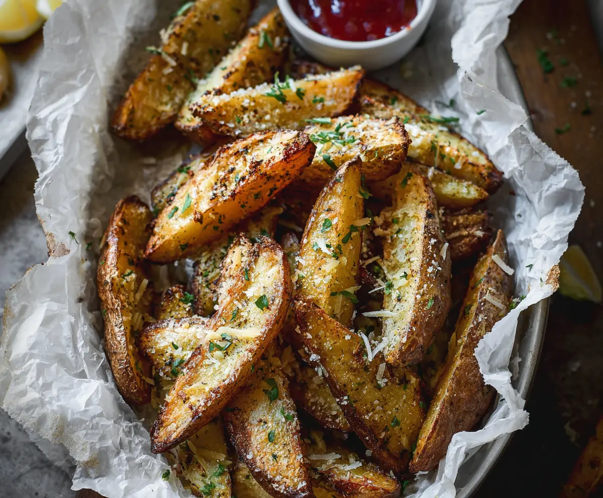 Finish by garnishing the wedges with fresh chopped parsley. Serve the crispy garlic Parmesan potato wedges hot, alongside lemon wedges and your favorite dipping sauce, like ketchup.
