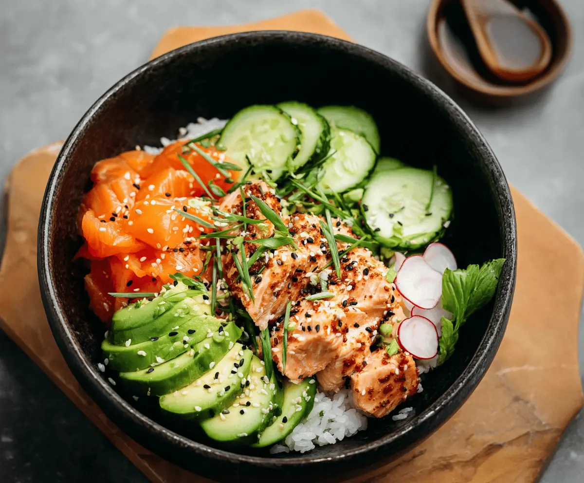 To make a vegan version, simply substitute the salmon with tofu or tempeh, which can be marinated and pan-fried for flavor. Replace the eggs with avocado or skip them entirely and enhance the bowl with extra veggies!