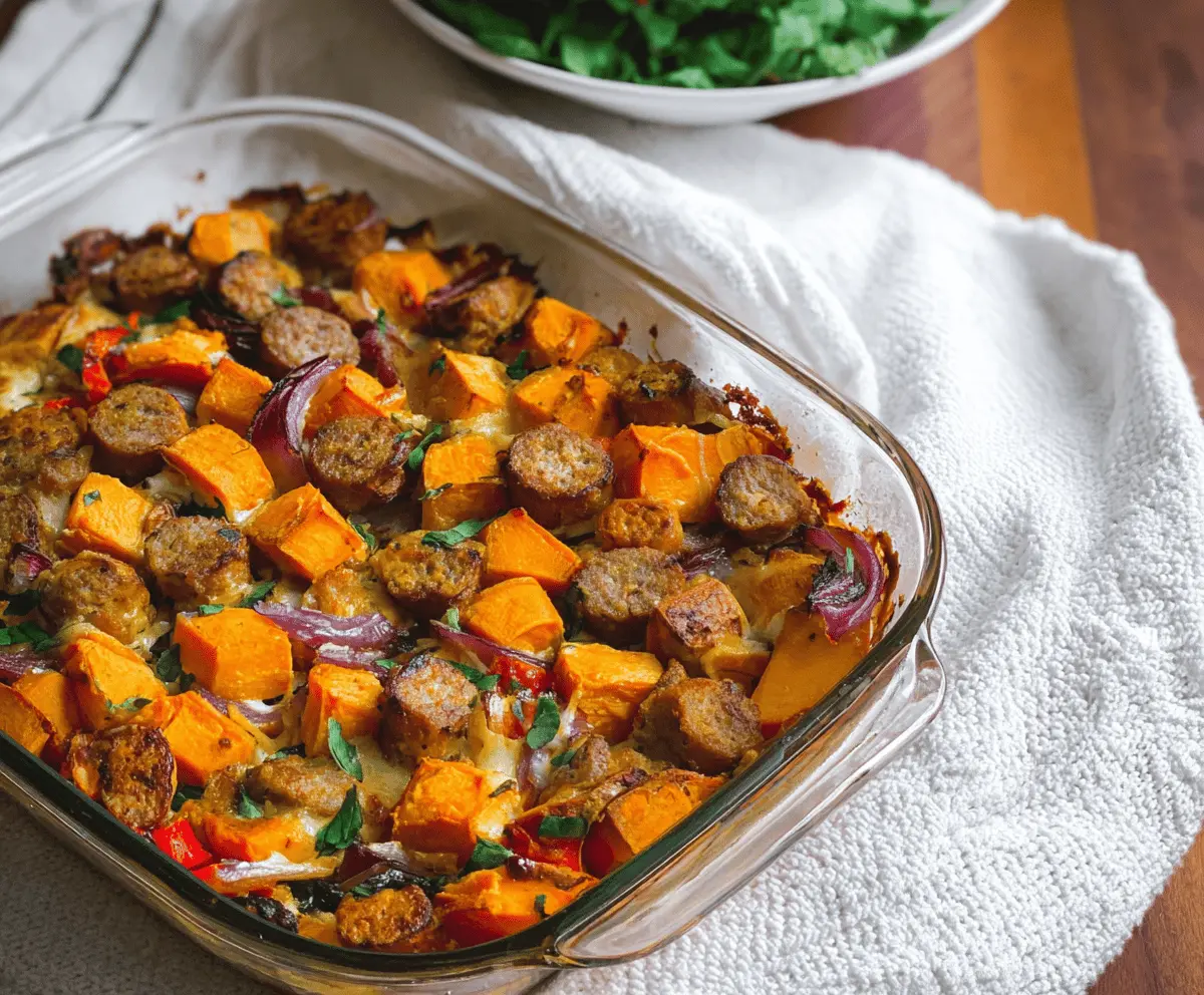 This dish combines savory sausage with the natural sweetness of roasted sweet potatoes and the creaminess of eggs and cheese, resulting in a comforting and nutritious meal that’s perfect for any occasion! Enjoy! 🍽️