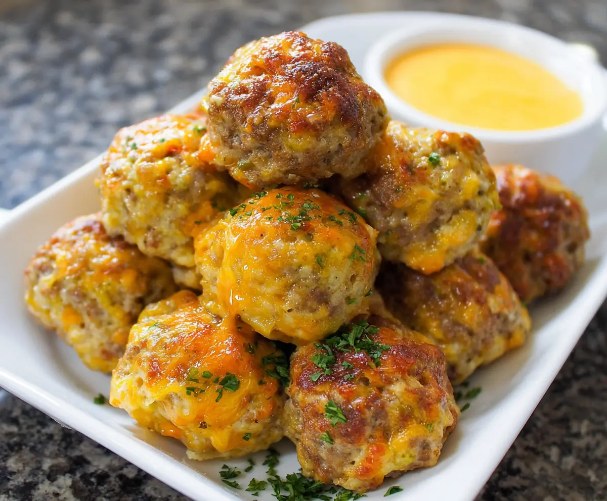 Finally, sprinkle some chopped fresh parsley on top for a pop of color. Serve these delicious sausage cheese balls warm with honey mustard or your favorite dipping sauce. Enjoy!