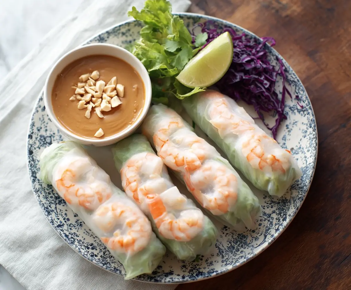 Enjoy these fresh, vibrant shrimp spring rolls with their creamy, flavorful peanut dipping sauce!