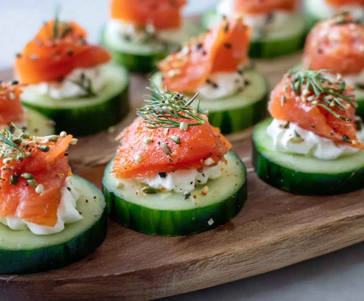 These Smoked Salmon Cucumber Bites are a refreshing treat! Crisp cucumber rounds topped with creamy cheese and savory smoked salmon create a perfect little snack.