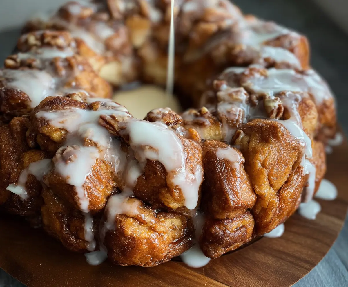 Once baked, let the monkey bread cool in the pan for about 5-10 minutes. After cooling, carefully invert it onto a serving plate. Drizzle the icing generously over the warm monkey bread.