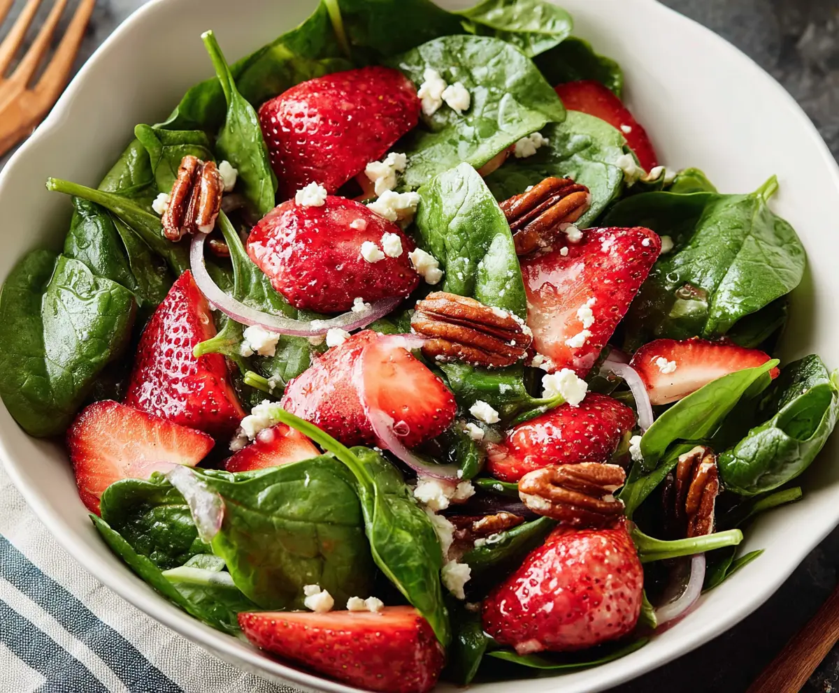 This fruity salad mixes fresh spinach with sweet strawberries and crunchy nuts, making it colorful and delicious! A drizzle of tangy dressing ties it all together.