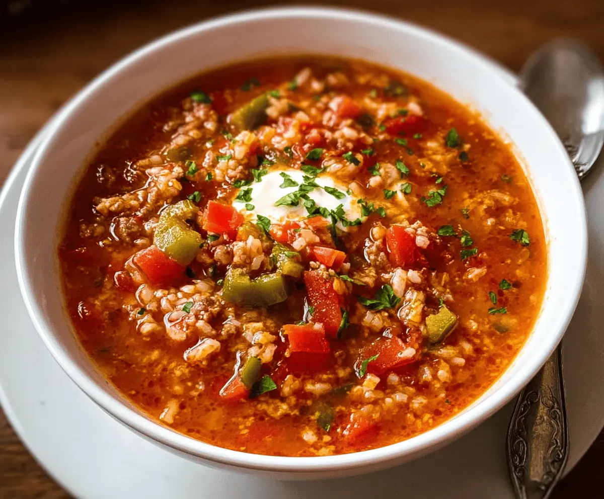 Serve the soup hot, garnished with fresh parsley or cilantro on top. Enjoy every cozy spoonful of your Stuffed Bell Pepper Soup!