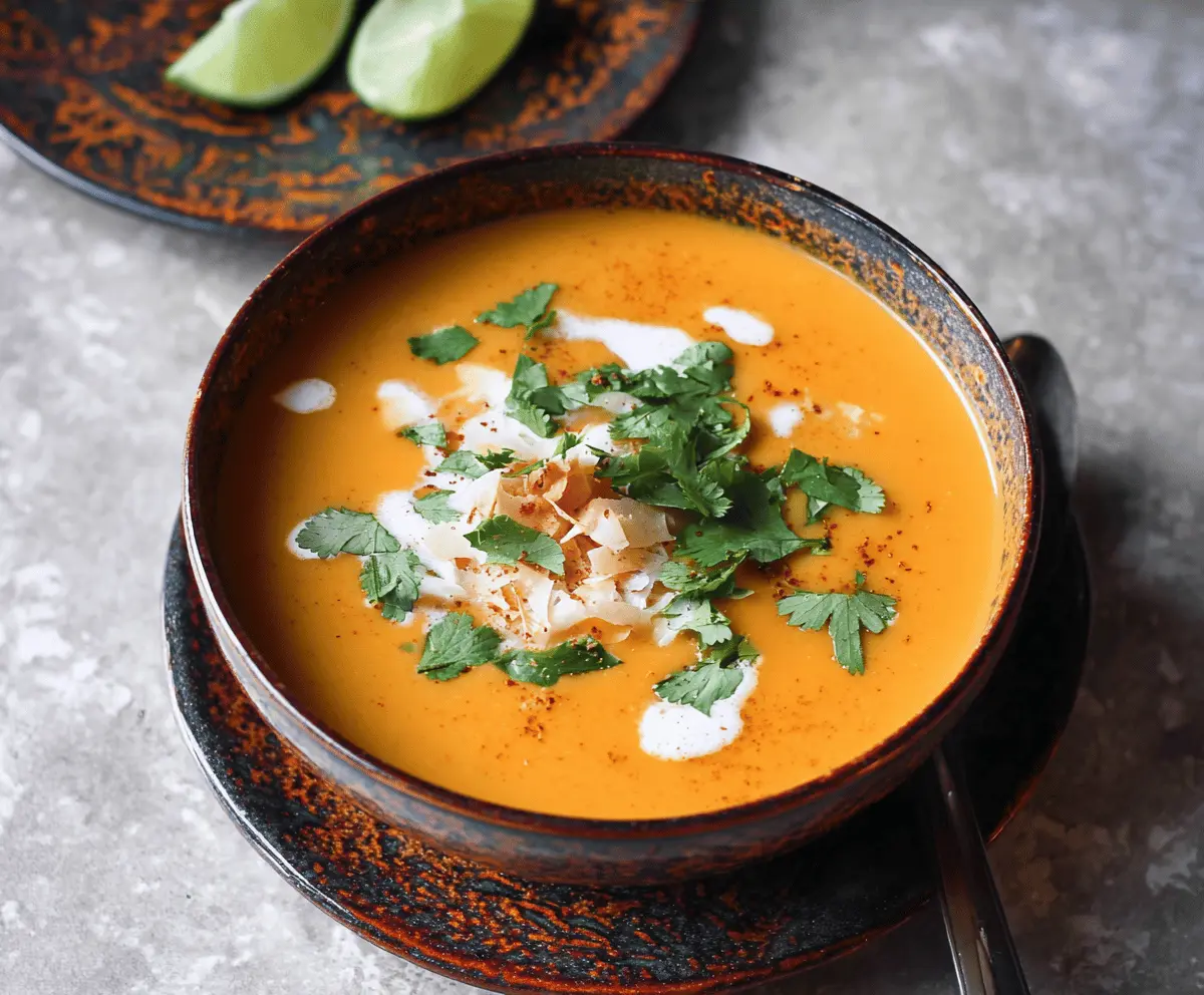 Now it’s time to serve! Ladle the soup into bowls and drizzle a little extra coconut milk on top. Garnish with chopped cilantro or parsley, a sprinkle of red chili flakes for a kick, and toasted coconut flakes if you like. It looks gorgeous!