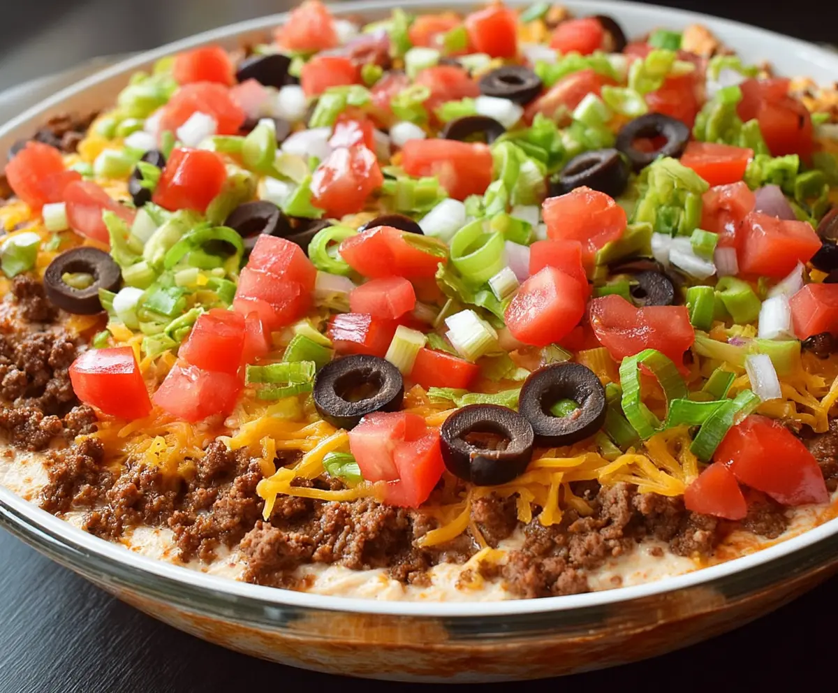 This taco dip is creamy, savory, and packed with fresh flavors. The vibrant colors from the toppings make it not only taste great but look fantastic, too!