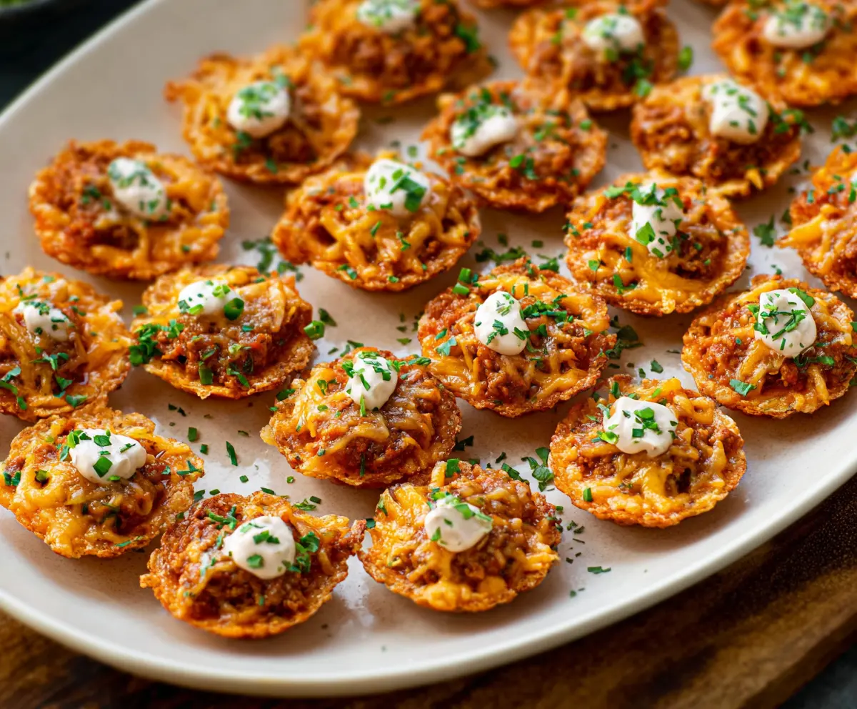 Now, sprinkle a generous amount of shredded cheese on each chip with the meat mixture. Pop the tray in the oven for 8-10 minutes. Keep an eye on them; when the cheese is melted and bubbly, they’re ready!