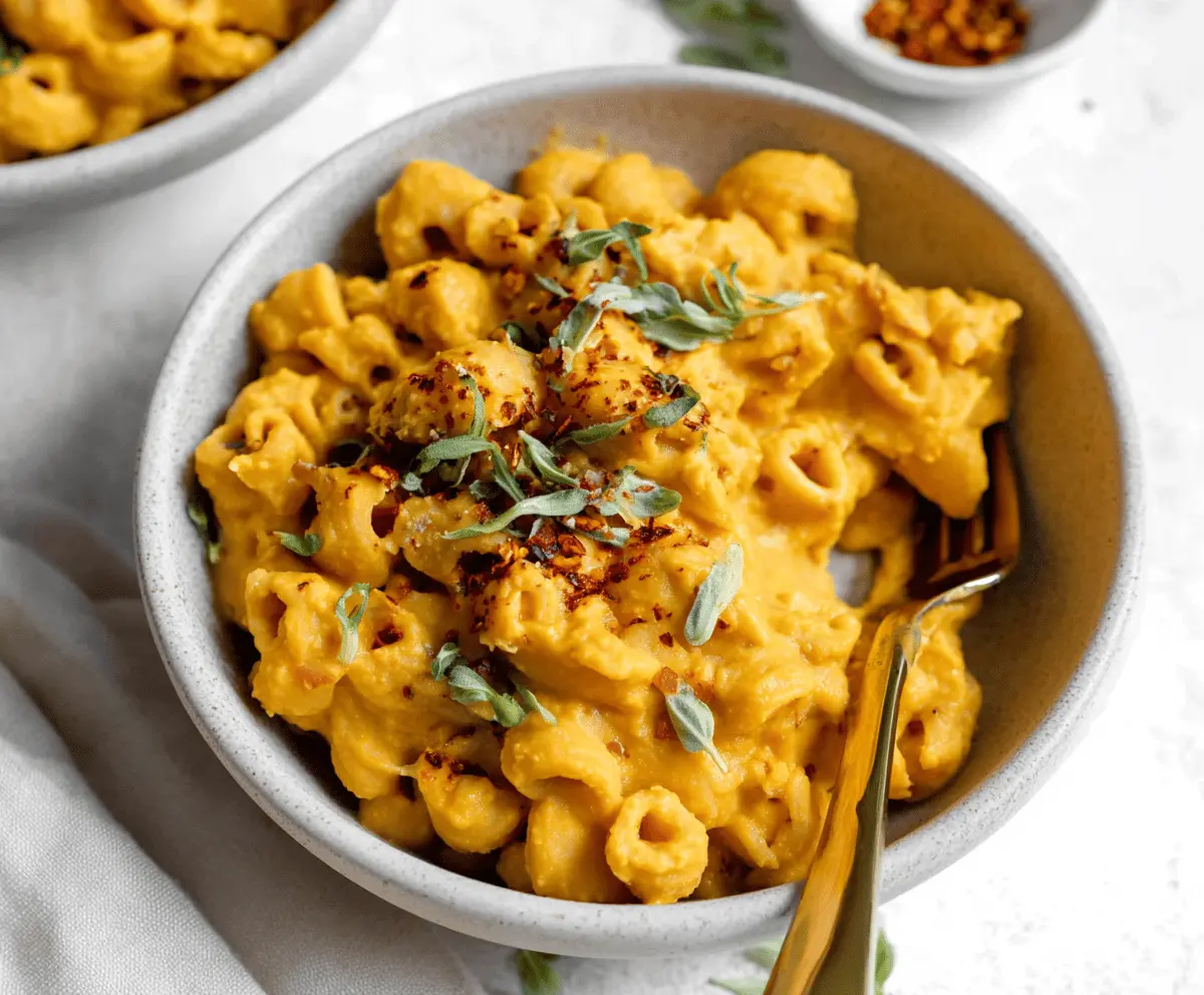 Serve your delicious vegan sweet potato mac and cheese immediately. For an extra kick, garnish with a sprinkle of red pepper flakes and some fresh herbs like thyme or parsley, if you like.